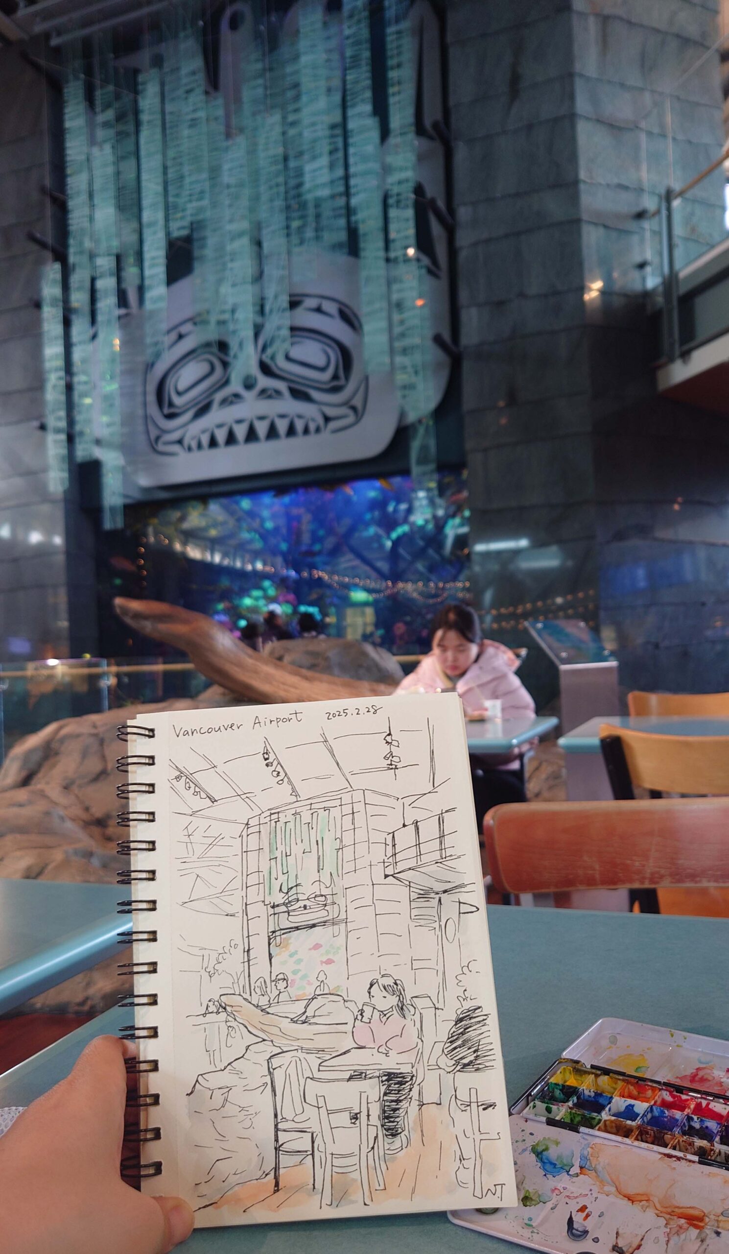 魚がキラキラと泳いでいる大きな水槽があるところでスケッチしてみたが、眠い…。