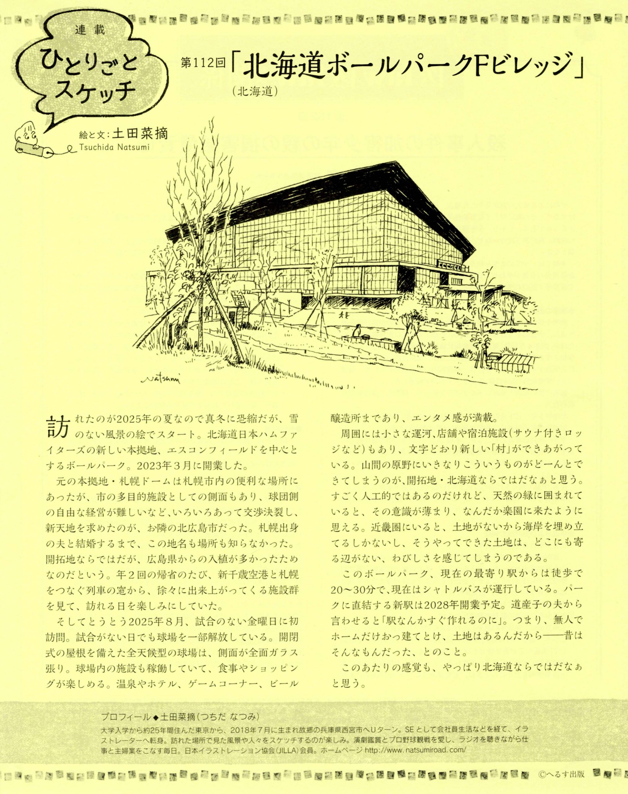イラスト&コラム連載「ひとりごとスケッチ」第112回「北海道ボールパークF ビレッジ」 2026-03-22 最終更新日時 : 2026-03-22 TsuchidaNatsumi 第112回「北海道ボールパークF ビレッジ」- へるす出版「小児看護」2026年2月号掲載 (>公式サイト) WBC残念だったな~、と思ってうちに、もうすぐプロ野球開幕!真剣に見るようになった頃のような熱意はもうないのだけれど、例年の風物詩として始まるとなんだかホッとするような、生活の一部になっております。 試合のない、夏の日に訪れたエスコン。次回は観戦するぞー! お問い合わせ 制作依頼・ご感想・ご質問・お見積りなど、お気軽にお問い合わせください お問い合わせフォームへ FacebookXBlueskyHatenaCopy
